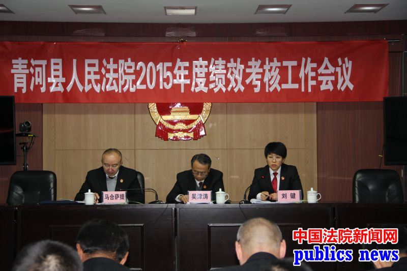 全民公众讯(王旭)12月8日,青河县人民法院组织召开2015年度绩效考评会,阿勒泰地区中院党组成员、常务副院长吴津涛带领考核组一行莅临青河县法院,对基层法院队伍建设、审判业务、司法政务管理等各项工作开展情况进行工作绩效考核。