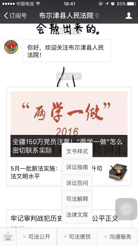 据了解,布尔津法院微信公众平台为订阅号,与官方微博实行差异化运营。官方微博主要为公众提供信息宣传,微信公众平台主要为公众提供各项司法服务。微信公众平台主要有“司法公开”、“司法便民”、“沟通服务”三大模块和十三个子模块,涵盖立案、审判、执行等各个工作环节,可以为用户提供审判执行公开、诉讼指南、文书查询等多项功能。