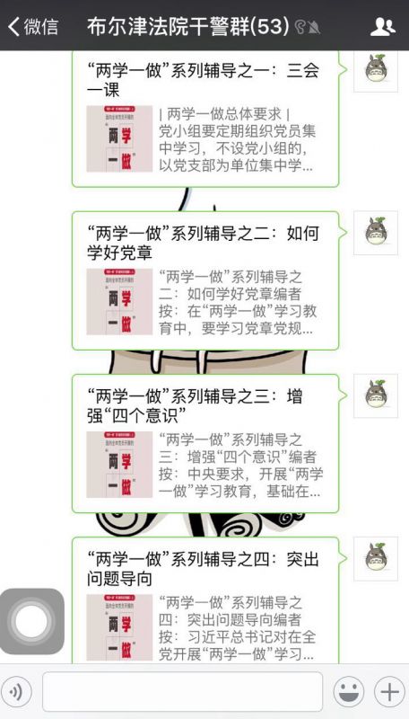 微信群聊平台的建立和运行,充分调动了党员干警的主观能动性,创新了工作方式,在党支部和党员之间架起了一座无形的桥梁,在党员中形成了“轻松自主学习、实时互动交流”的良好学习氛围,为持续开展“两学一做”活动提供了源源动力。