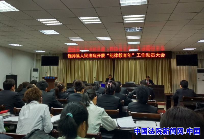 中国法院新闻讯(段新禄)近日,伽师县法院召开纪律教育年学习动动员大会,向全院干警传达落实新疆维吾尔自治区党委、喀什地委召开的全区纪律教育年学习动动员会议精神。院党组成员、政工科长孙维存宣读《2016年全院开展纪律教育年学习活动实施方案》,党组书记、副院长王洪桥作动员讲话,就此次活动进行了工作部署。
