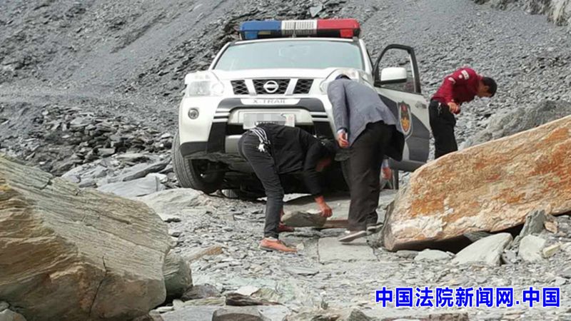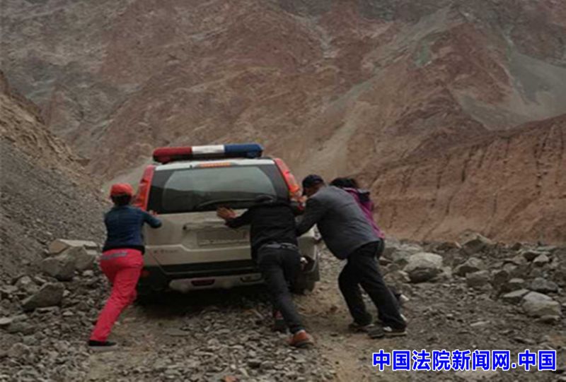 车辆爬坡困难,院党组成员、纪检组组长李必桥同志带领三名干警齐心协力共助车辆顺利上坡。
