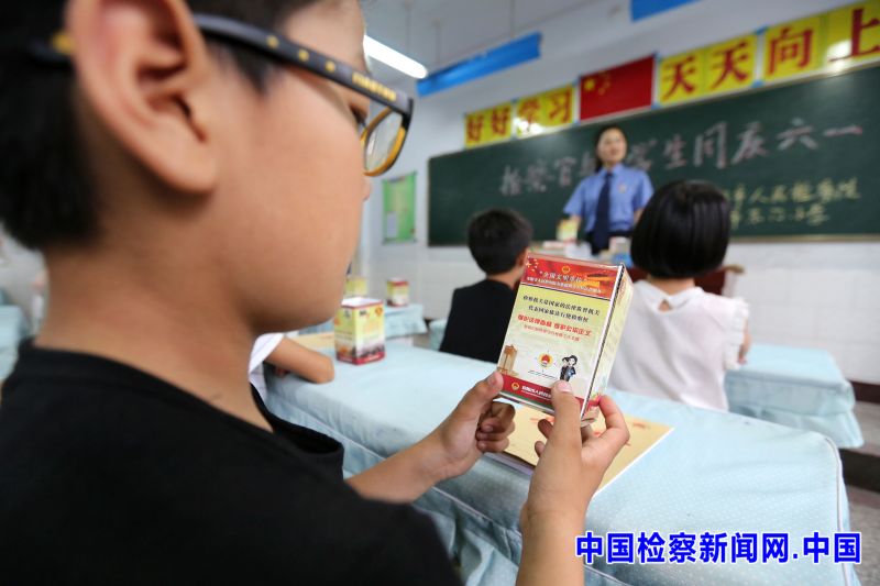 6月3日下午,河南省安阳市文峰区东门小学四级4班“法制课堂”上,一名男孩正在欣赏安阳检察院干警带来的“创意笔筒”。
