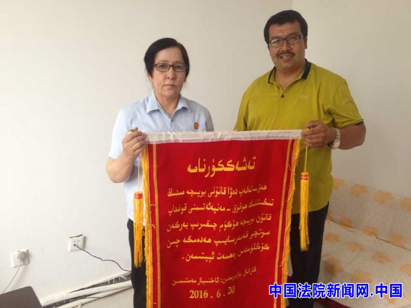 这是发生在2016年6月28日下午新疆和田县人民法院立案大厅的一幕。案件当事人阿合尼亚孜·麦米提明专门从阿克苏赶来送一面锦旗,对该院的法官公正审理和高效执行表示感谢。