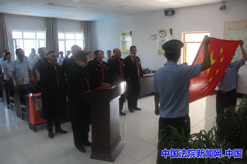 中国法院新闻讯(陈兴梅)“我宣誓:忠于中华人民共和国宪法,维护宪法权威,履行法定职责,忠于祖国、忠于人民,恪尽职守、廉洁奉公,接受人民监督,为建设富强、民主、文明、和谐的社会主义国家努力奋斗!”7月26日,经新疆木垒县人民法院院长提请木垒县人大常委会任命的5名新任职审判员在副院长陈伟的带领下,在县人大常委会副主任白仲本的监督下,身着法官袍,面对鲜艳的五星红旗向宪法庄严宣誓就职。木垒县人大常委会副主任白仲本见证了宣誓仪式。