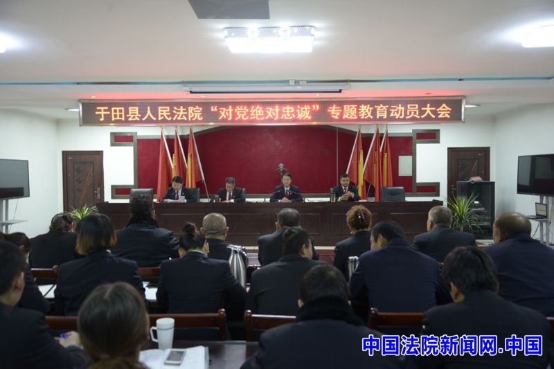 中国法院新闻讯(侯芳)为深入贯彻落实党的十八届六中全会和自治区第九次党代会精神,聚焦社会稳定和长治久安总目标,全面落实从严治党要求,严肃党内政治生活,加强党内监督,打造一支政治坚强、能力突出、素质过硬的党员干部队伍,推动“对党绝对忠诚”专项教育深入扎实开展,近日,于田县人民法院召开“对党绝对忠诚”专项教育动员会。会议由纪检组长王崇坤主持并宣读《于田县法院开展“对党绝对忠诚”专项活动实施方案》,党组书记王拥军做了动员讲话,全院干警参加会议。