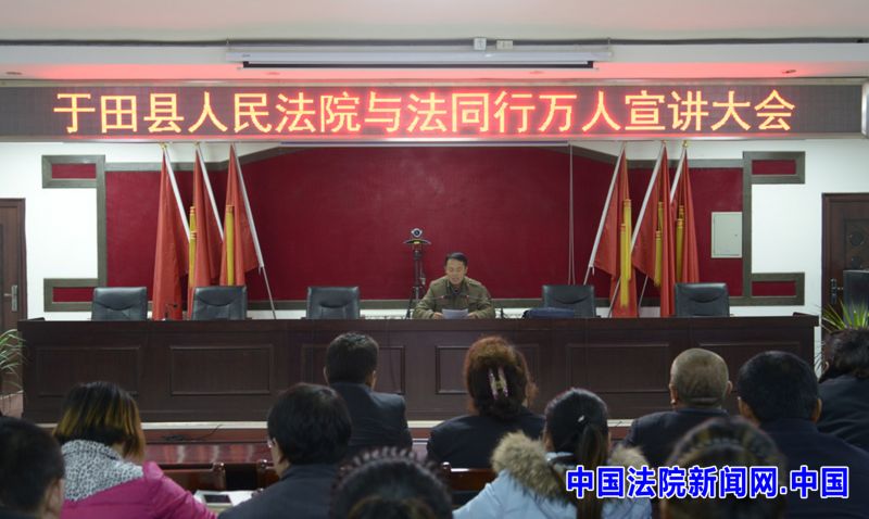 中国法院新闻讯(夏瑞杰)为全面贯彻落实党的十八届四中、五中、六中全会精神,贯彻落实习近平总书记关于新疆工作总目标再动员会议、自治区第九次党代会精神中提出的“持续抓好‘与法同行万人宣讲’活动”的要求,不断提升领导干部讲法治的能力和水平,不断扩大法治宣传教育的覆盖面和影响力,于田县人民法院于2016年11月28日举办了“与法同行万人宣讲”活动,该院全体干警共计54人参加了此次活动。