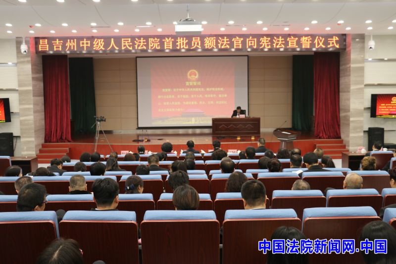 12月2日下午,昌吉州中院在二楼大法庭举行入额法官宣誓活动,院党组成员、纪检组长、政治部主任谢永德主持了宣誓活动,52名首批员额法官身着法袍,举起右拳,在党组书记、副院长、二级高级法官王彩霞的领誓下,面向国旗,向宪法庄严宣誓。